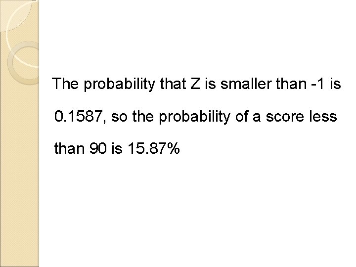 The probability that Z is smaller than -1 is 0. 1587, so the probability of a score less than 90 is 15. 87%