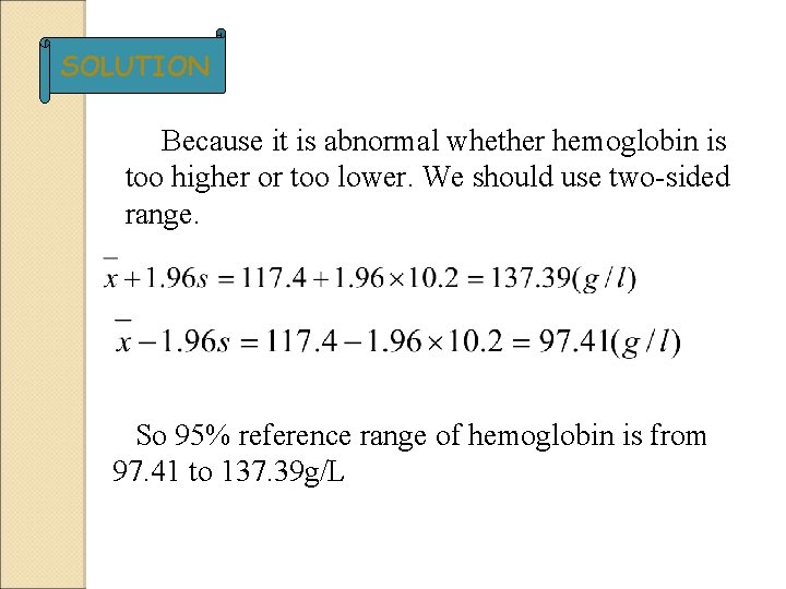 SOLUTION Because it is abnormal whether hemoglobin is too higher or too lower. We should use two-sided range. So 95% reference range of hemoglobin is from 97. 41 to 137. 39 g/L