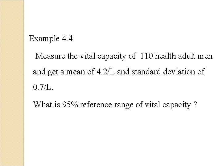 Example 4. 4 Measure the vital capacity of 110 health adult men and get a mean of 4. 2/L and standard deviation of 0. 7/L. What is 95% reference range of vital capacity ?