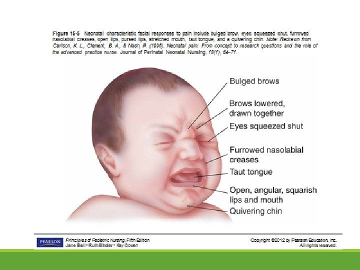 Behavioral Pain Scales CRIES (p. 160, Wong) ◦ Crying, Requires O 2, Increased vital signs, Expression, Sleeplessness FLACC (p. 159, Wong) ◦ Face, Legs, Activity, Cry, Consolability NIPS (Neonatal Infant Pain Scale) (p. 159, Wong) ◦ Expression, cry, breathing, arm and leg movements, arousal state