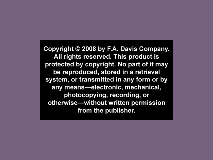 Credits Publisher: Margaret Biblis Acquisitions Editor: Andy Mc. Phee Developmental Editor: Yvonne N. Gillam Production Manager: Samuel A. Rondinelli Manager, Electronic Development: Kirk Pedrick Technical Project Manager, EP: Frank Musick Design Associate, EP: Sandra Glennie The publisher is not responsible for errors or omission or for consequences from application of information in this presentation, and makes no warranty, expressed or implied, in regards to its content. Any practice described in this presentation should be applied by the reader in accordance with professional standards of care used with regard to the unique circumstances that may apply in each situation.