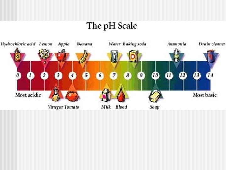 B. Physical Properties of Acids and Bases 1. Acid – p. H of 0 -6. 9 and taste sour. Example: citrus fruit & soda 2. Neutral – p. H of 7. Example: water 3. Bases – p. H of 7. 1 – 14, taste bitter, and feel slippery. Example: soap & ammonia