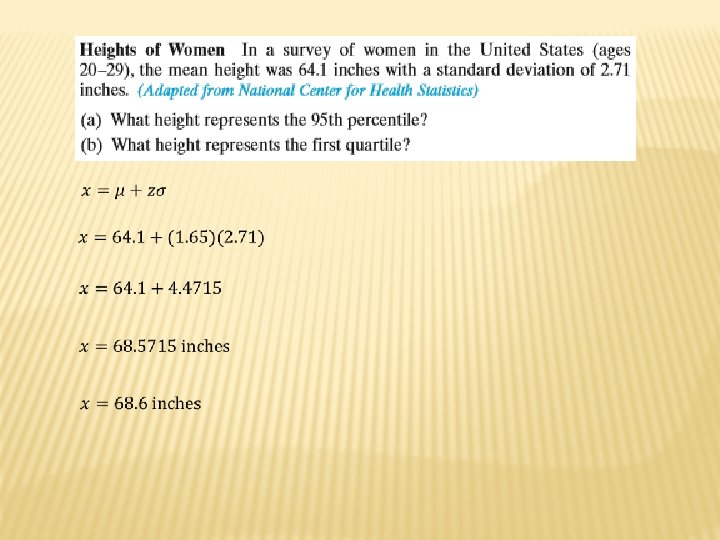 a) What height represents the 95 th percentile? We need to find the x-value. We also need to find the z-score. The 95 th percentile converts to an area of. 9500 The area in Table 4 closest to. 9500 is. 9505, which is a z-score of 1. 65 Use the following formula to find the value, x: