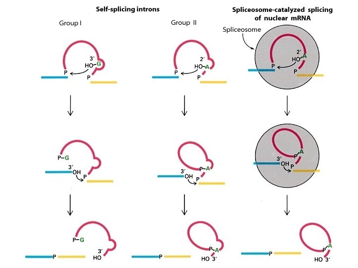 Classes of Ribozymes 1. Group I tetrahymena – Self-splicing – Initiate splicing with a G nucleotide – Uses a phosphoester transfer mechanism – Does not require ATP hydrolysis. 2. Group II self-splicing – Initiate splicing with an internal A – Uses a phosphoester transfer mechanism – Does not require ATP hydrolysis