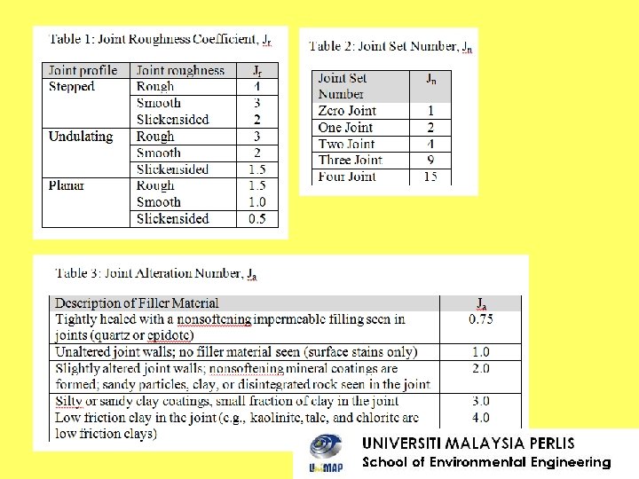 SOLUTION, Q Q = (RQD/Jn) x (Jr/Ja) x (Jw/SRF) The known values are as follows. RQD = 60%. Since there are two sets of joints, Jn = 4 (Table 2). From Table 1, for undulating, rough joints, Jr = 3. From Table 3, since most joints are filled with silts and sands, Ja = 2. From Table 4, Jw = 0. 66. From the text above, SRF = 5. Hence Q = (60/4) x (3/3) x (0. 66/5) = 1. 98