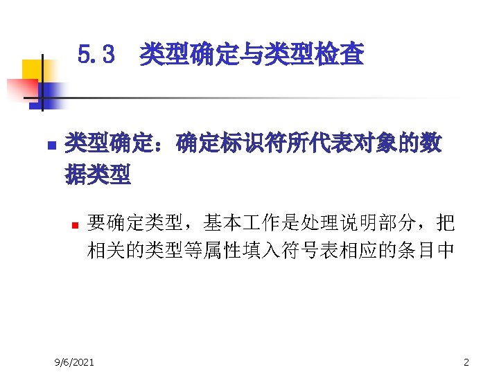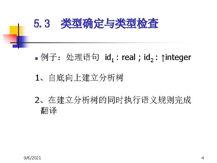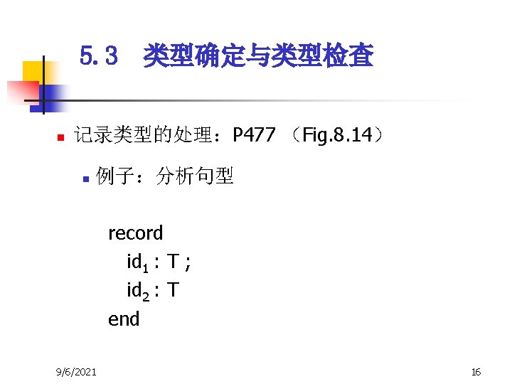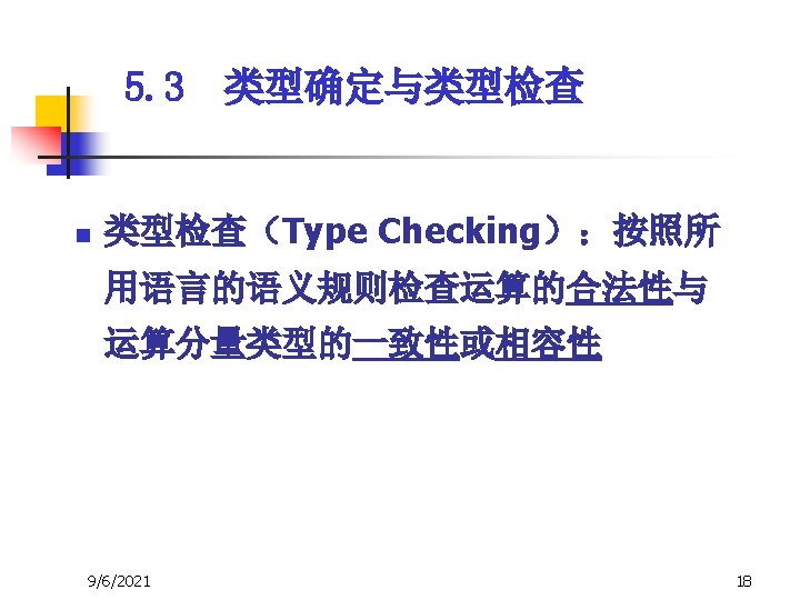 5. 3 类型确定与类型检查 n 3、E → E 1 op E 2 { E. type : = if E 1. type=integer and E 2. type=integer then integer else type-error } — 一致性检查 * 假设 op 的运算分量必须是integer,结果 也是integer 9/6/2021 20
