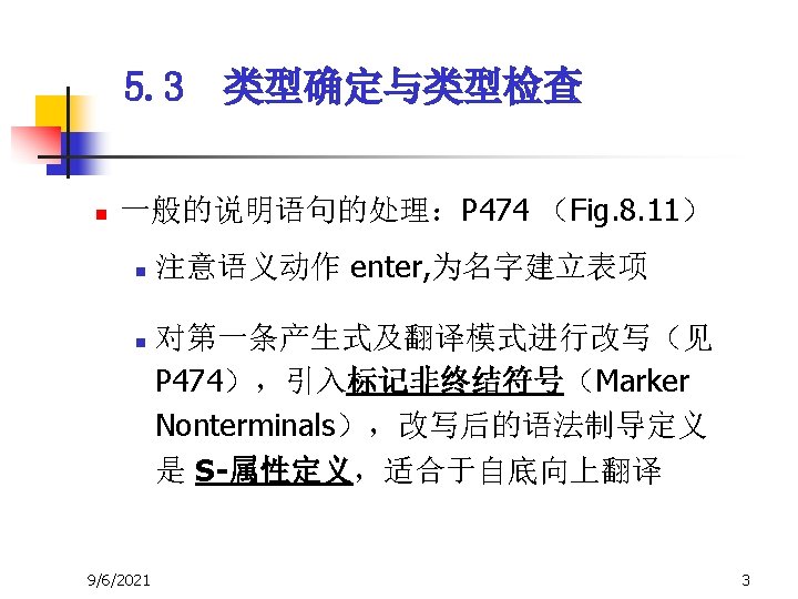 5. 3 类型确定与类型检查 P 8 1 M D 3 ε id 1 real 0 id 2 pointer(integer 8 ) D 1 : ; 7 D 2 T 1 id 2 : 2 real 6 T 2 5 ↑ T 3 4 integer * 对说明语句的语义处理不产生中间代码 9/6/2021 5
