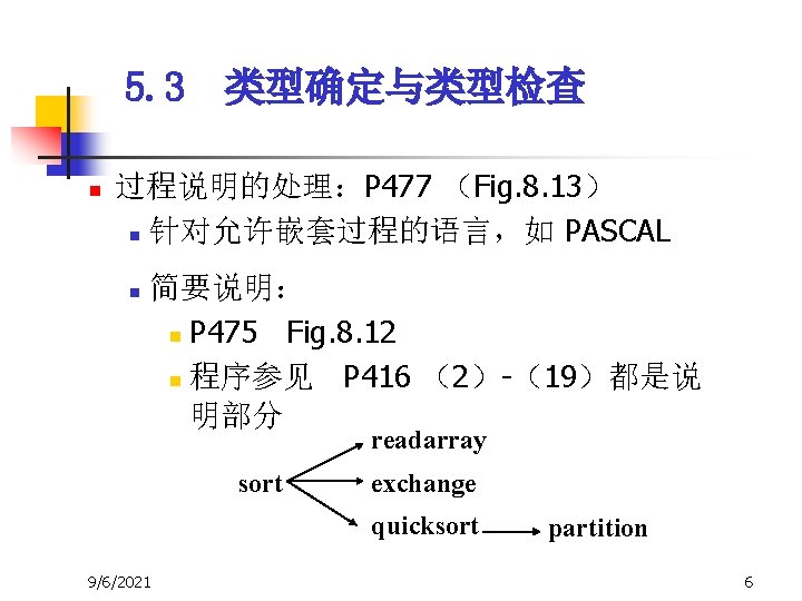 5. 3 类型确定与类型检查 n P 477 (Fig. 8. 13) n n n 9/6/2021 此翻译模式只是一种解决方案 语义过程 mktable,enter,addwidth, enterproc 栈 tblptr,offset 7