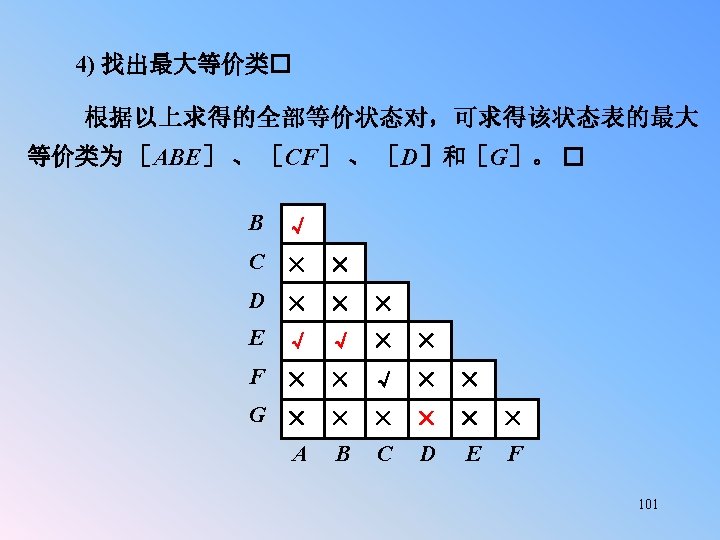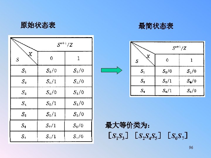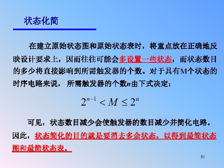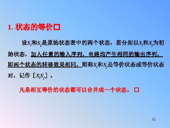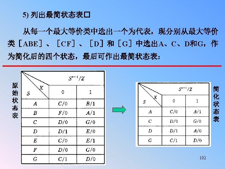 Replaced F and G using E, then the state table with five states: Example 5. 13 (Con. ): q x=0 A B C D E F G C E G A A q x=0 A B C D E C E E A A q* q* x=1 x=0 B D F A A 0 0 0 0 x=1 x=0 B D E A A 0 0 0 z x=1 0 0 0 1/1 0/0 D A X/0 1/0 B 0/0 X/0 1/0 D 1/0 0/0 F E 1/1 0/0 C G A B 1/0 0/0 X/0 0/0 C X/0 E 90