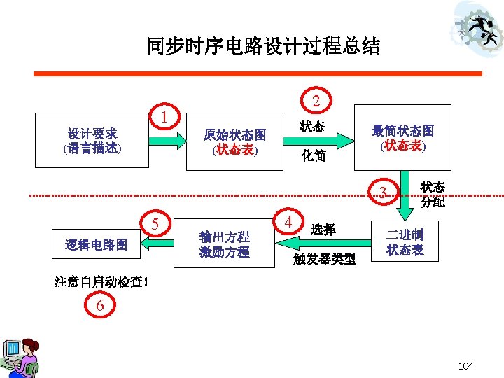 § 5. 3 The Design Process for Synchronous Sequential Systems(P 337) 1 Design aim (Word description) 2 Original State diagram (state table) State reduce Reduced State diagram (state table) 3 5 Logic Circuit To check whether it can turn on by itself? Input equation Output equation Select the type of Flip Flops State assign Binary state table 4 6 59