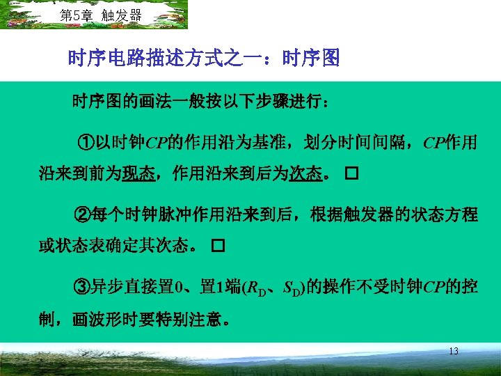 Sequential systems can be represented in many forms. Ø State (transition) table 【状态(转移)表】 Ø State diagram 【状态图】 Ø State equations 【状态方程】 Ø Flip-flop input (excitation) funcations 【激励方程】 Circuit output functions 【输出方程】 Ø Timing diagram 【时序图】 Ø Circuit diagram 【电路图】 These equivalent forms show the inputs, outputs, and flipflop state changes for sequential circuits. 36