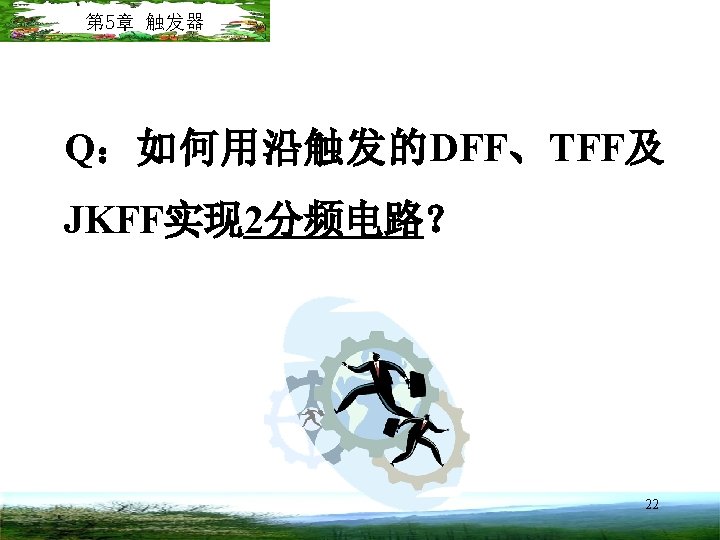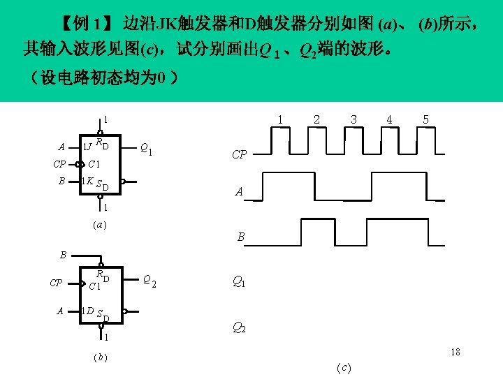 q JK § 5. 1 0 0 0 1 00 11 10 1 1 Latches and Flip Flops(Con. ) 1 0 0 1 n J 0 0 1 1 01 K 0 0 1 1 J q K q JK flip-flop: itq*is a combination of the RS and T. q 0 1 0 1 q* 0 1 0 0 1 1 1 0 J 0 0 1 1 K 0 1 q* q 0 1 q 10 11 保持 复位 置位 翻转 00 01 0 JK 1 00 10 01 11 State diagram JK-FF Behavioral table From the first truth table, we can map it and derive the equation for q*: A timing example is shown in Figure 5. 20, on Page 336 17