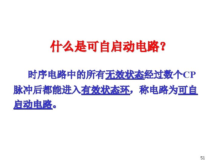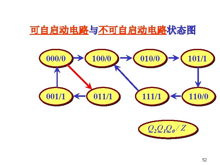 2. State equation 3. State table and state diagram This sequential circuit is Moore model. 000 001 010 101 100 111 110 Q 2 Q 1 Q 0 011 有效状态、无效状态、自启动 48