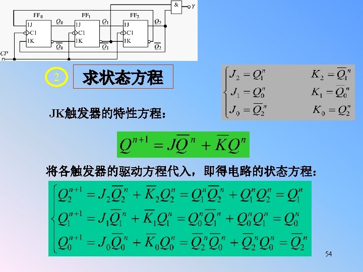 § 5. 5 The Design of Synchronous Counters (Cont. ) Example 5. 5. 1: Design a synchronous counter using JK flip flop, n whose module is 5. State transition is shown as below 000 001 011 101 110 Explanation: 1. List the state table According to the subject, there are 3 state-variables, which are refered to as 、. Then binary state table as follows. 0 0 0 1 1 0 1 0 1 0 0 X 1 0 X 0 1 1 1 X X 0 1 X X 1 0 0 0 X X 1 0 00 X 00 01 1 01 X 11 11 1 10 X 10 1 X 1 、 0 1 X X 00 1 1 01 1 X 11 1 10 X X 72