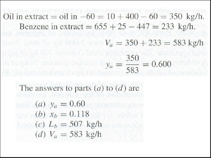 Solution Let x and y be the mass fractions of oil in the underflow and overflow solutions. At the solvent inlet, Determine the amount and composition of the solution in the spent solids by trial. If Xb = 0. 1, the solution retained, from Table 23. 1, is 0. 505 kg/kg. Then;