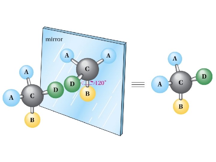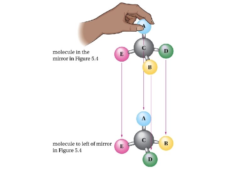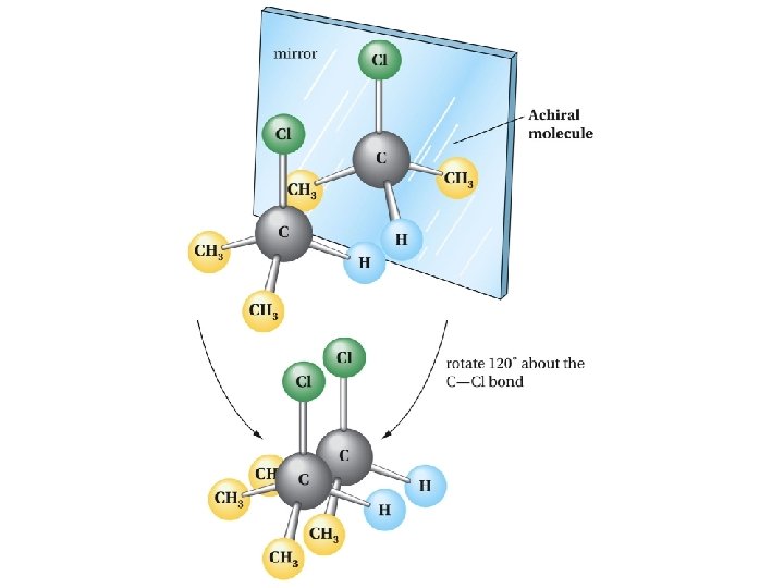 5. 1 Chirality and Enantiomers • A molecule (or object) is either chiral or achiral. The word chiral, pronounced “kairal” to rhyme with spiral, comes from the Greek (cheir, hand). A chiral molecule (or object) is one that exhibits the property of handedness. An achiral molecule does not have this property. • What test can we apply to tell whether a molecule (or object) is chiral or achiral? • We examine the molecule (or object) and its mirror image. The mirror image of a chiral molecule cannot be superimposed on the molecule itself. The mirror image of an achiral molecule, however, is identical to or superimposable on the molecule itself.