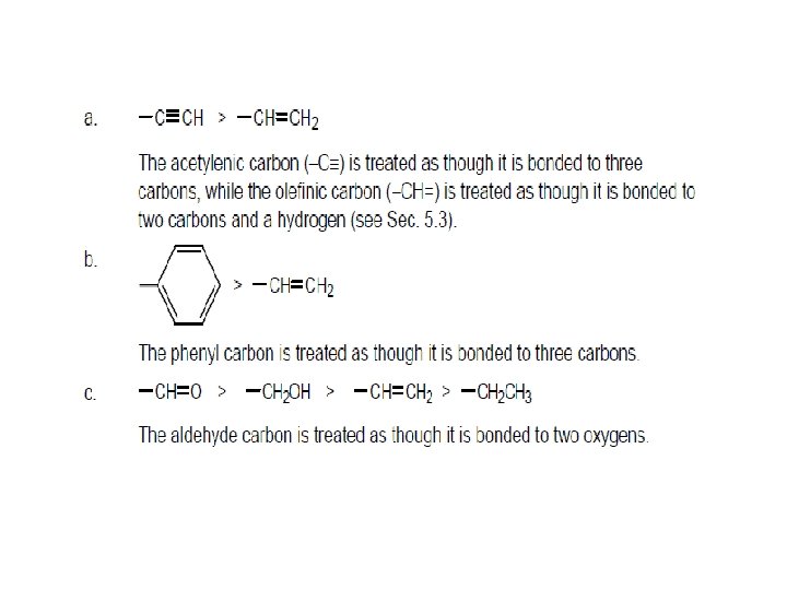 Rule 2 If a decision cannot be reached with rule 1, work outward from the stereogenic center until a decision is made. Example of ethyl and methyl below. PROBLEM 5. 8 Assign a priority order to each of the following sets of groups: a. -CH(CH 3)2, -CH 3, -H, -NH 2 b. -OH, -Br, -CH 3, -CH 2 OH c. -OCH 3, -NH(CH 3)2, -CH 2 NH 2, -OH d. -CH 2 CH 3, -C(CH 3)3, -CH(CH 3)2