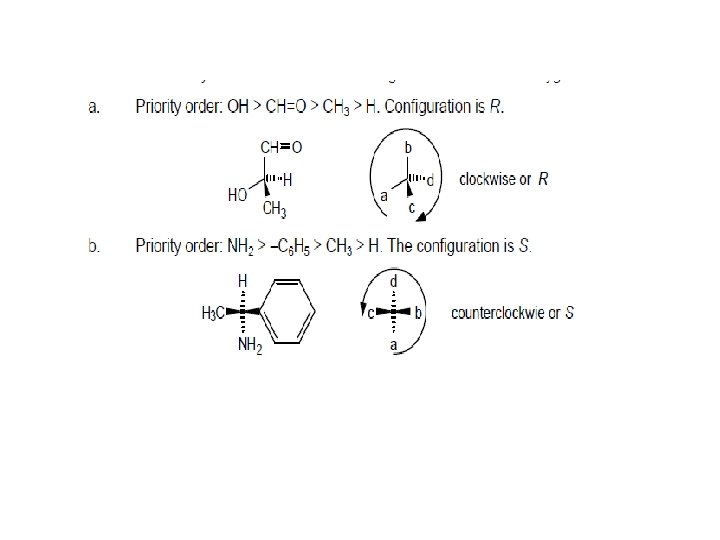 Now view the molecule from the side opposite the lowestpriority group (-H) and determine whether the remaining three groups, from high to low priority, form a clockwise (R) or counterclockwise (S) array.