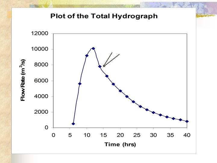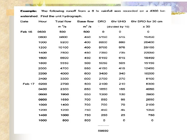 Solution Contd. n n n Total volume of flow = 59850 m 3 /s x 2 hrs = 59850 m 3 /s x 2 x 3600 s = 430. 9 x 106 m 3 Area of catchment = 4300 km = 4300 x 100 ha = 4300 x 100002 m 2 = 4300 x 106 m 2 Effective rainfall per unit area = 0. 1 m =10 cm To obtain 1 cm i. e. 1 unit hydrograph, divide DRO column ordinates by 10. If 6 hr DRO for 30 cm is required, multiply UHG ordinates by 30