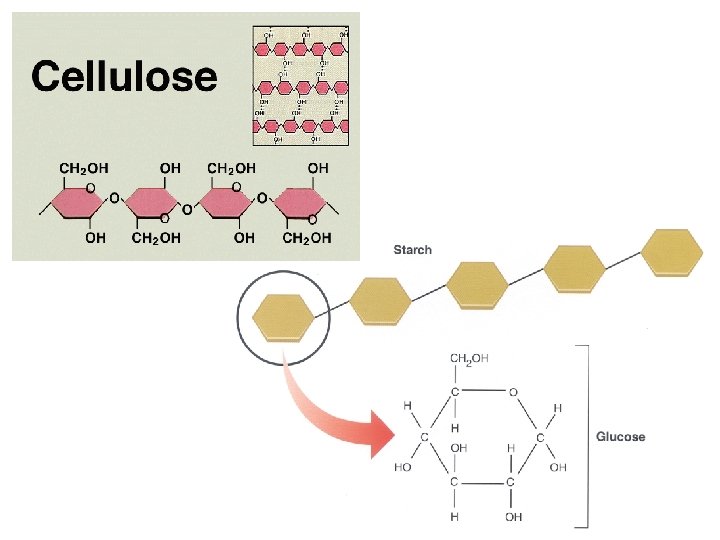 Structural Polysaccharides ● Like starch, cellulose is a polymer of glucose, but the glycosidic linkages differ a Glucose b Glucose a and b glucose ring structures Starch: 1– 4 linkage of a glucose monomers. Cellulose: 1– 4 linkage of b glucose monomers.