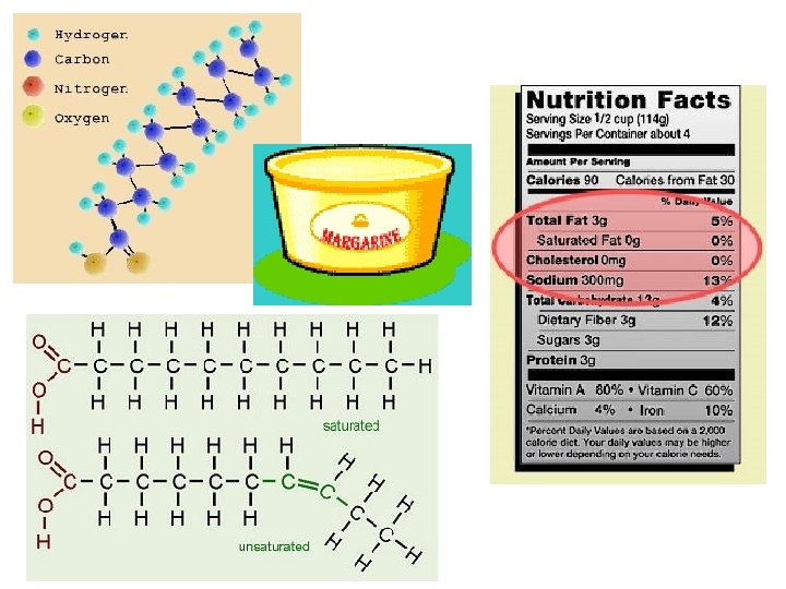 Saturated vs. Unsaturated Fats SATURATED FAT no C-C double bonds in fatty acid tail carbon skeleton bonded to max. # of hydrogens usually solid at room temp. most animal fats e. g. , bacon grease, lard, butter UNSATURATED FAT one or more C-C double bonds in fatty acid tail kinks at each C=C, so molecules do not pack closely enough to solidify usually a liquid at room temp. most plant fats e. g. , corn, peanut, olive oils