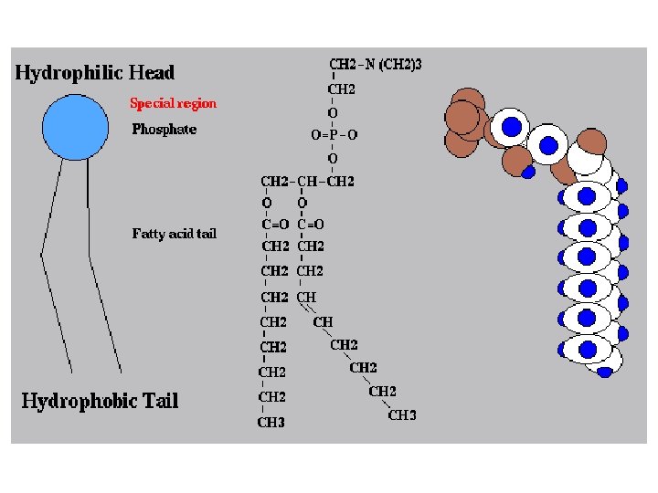 Hydrophobic tails Hydrophilic head Choline Phosphate Glycerol Fatty acids Hydrophilic head Hydrophobic tails Structural formula Space-filling model