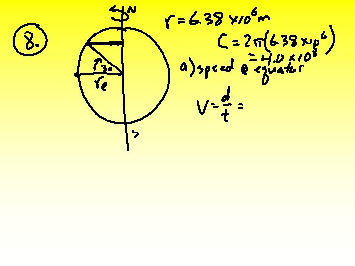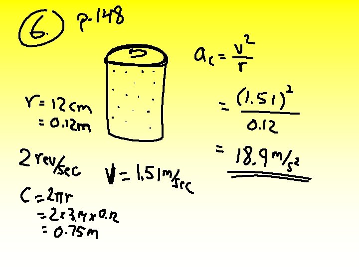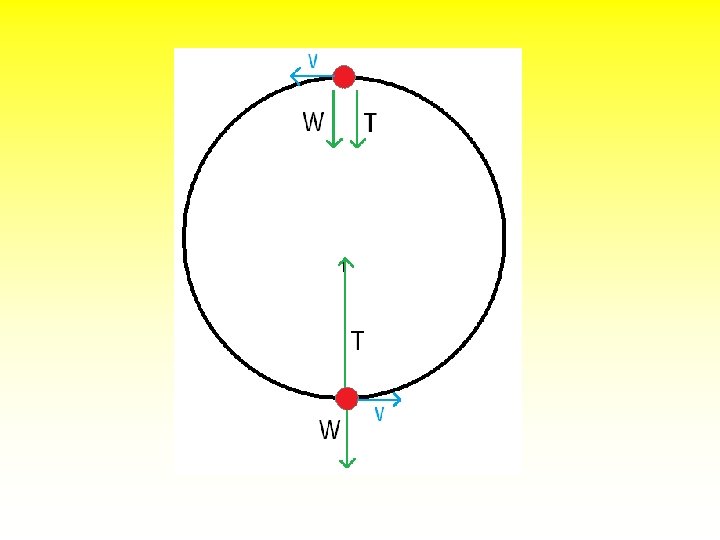 Example : A ball is spinning in a vertical circle at the end of a string that is 2. 0 m long. If the ball has a mass of 3. 5 kg and moves at a constant speed of 8. 0 m/s… a) Calculate the centripetal force that keeps the ball from flying away. Does this force change as the ball moves around the circle? 112 N, this force remains constant b) What two forces contribute to the centripetal force at the top of the circle? Calculate their values. Weight = 34 N, Tension = 78 N c) What two forces contribute to the centripetal force at the bottom of the circle? Calculate their values. Weight = 34 N, Tension = 146 N