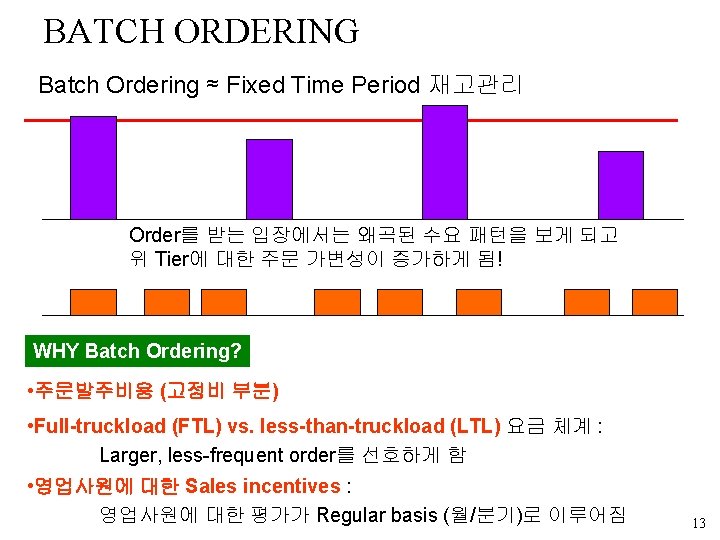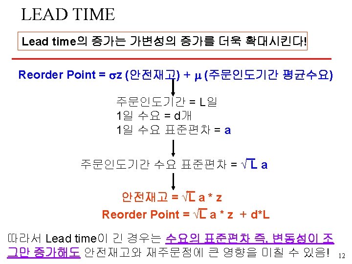 DEMAND FORECAST • Supply chain의 각 Entity는 자신 의 바로 윗 Tier의 Order 정보를 Market demand의 Trend로 간주 하는 경향이 있음 (착시 효과!) • 정보의 Noise로 인해 각 Entity는 Increased demand trend를 인지 한 것처럼 생각해서 Order quantity를 늘려 잡는 경향이 있 음 Customer Demand Retailer Order Lead Time Delivery Lead Time Wholesaler Order Lead Time Delivery Lead Time Distributor Order Lead Time Delivery Lead Time Factory Production Lead Time 11
