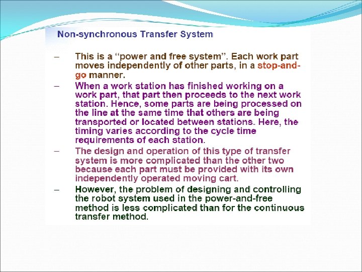 Robot-centred work cell Center of work cell High utilization of robot Method of work part delivery (eg: conveyor, part -feeders, pallets) Install for single robot servicing 1@more production machines