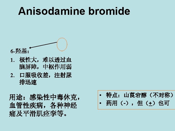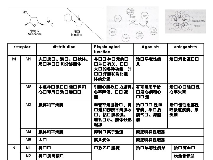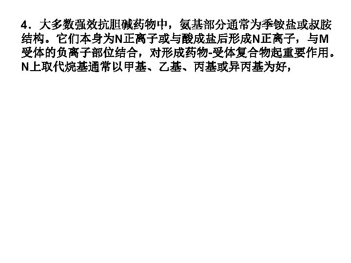 Anticholinergic drugs Muscarinic receptor blocking agents: Atropa belladonna alkaloids :atropine,scopolamine, anisodamine,anisodine N 1 receprot blocking agents:美卡拉明,六甲溴铵 N 2 receprot blocking agents