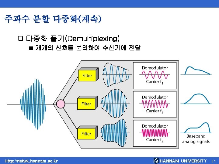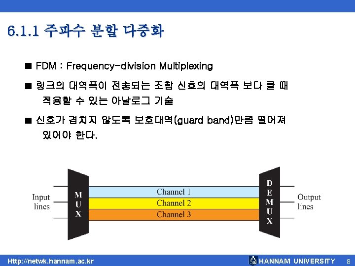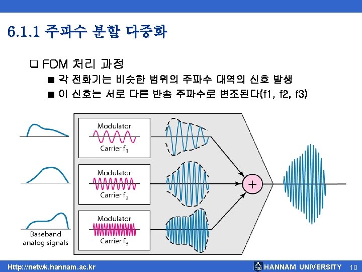 6. 1. 1 주파수 분할 다중화 FDM은 신호들을 합성하는 그 다중화 기술이다. 아날로 FDM is an analog multiplexing technique that combines analog signals. Http: //netwk. hannam. ac. kr HANNAM UNIVERSITY 9