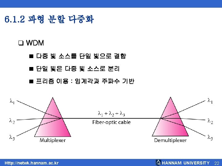 6. 1. 2 파형 분할 다중화 q WDM : Wavelength-division Multiplexing q 기본 개념은 FDM과 같으며, 광섬유의 고속 전송률을 이용하기 위해 설계 Http: //netwk. hannam. ac. kr HANNAM UNIVERSITY 21