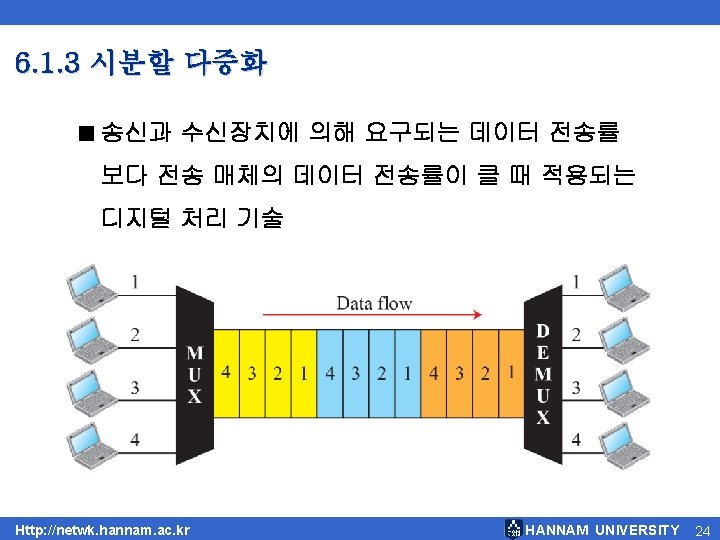6. 1. 3 시분할 다중화 TDM은 여러 개의 저속 채널을 하나의 고속 채널 로 조합하는 다중화 기술이다. TDM is a digital multiplexing technique for combining several low-rate channels into one high-rate one. Http: //netwk. hannam. ac. kr HANNAM UNIVERSITY 25