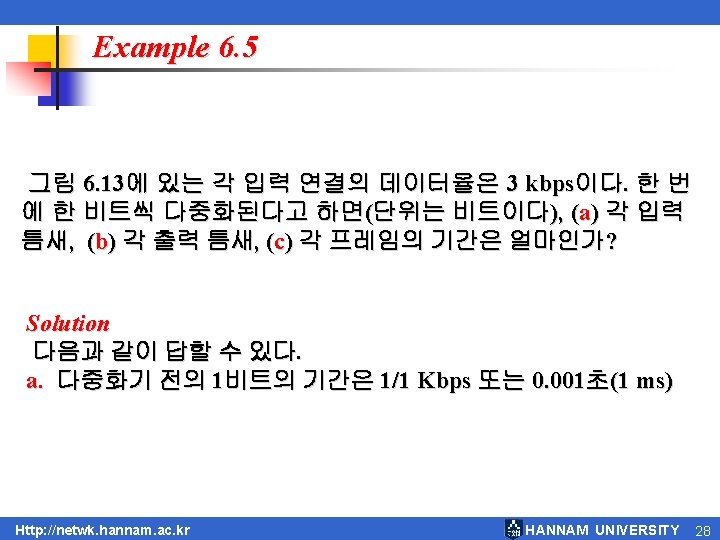 6. 1. 3 시분할 다중화 동기 TDM에서는 링크의 전송률은 n 배 빠르고 , 단위 기간은 n 배 짧다. In synchronous TDM, the data rate of the link is n times faster, and the unit duration is n times shorter. Http: //netwk. hannam. ac. kr HANNAM UNIVERSITY 27