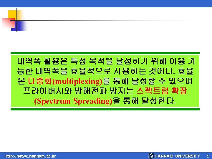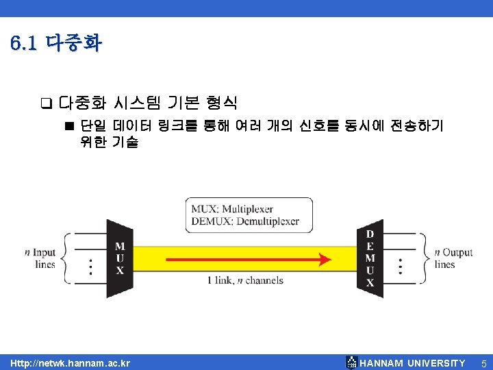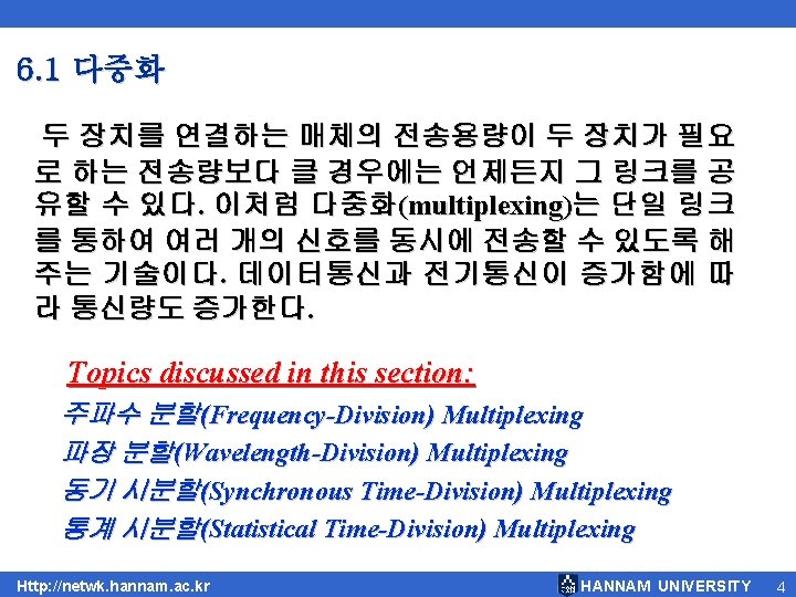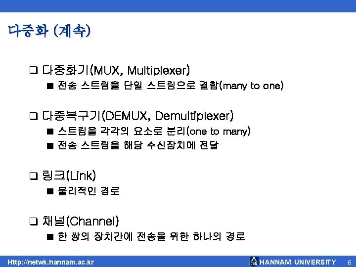 6 장 다중화(Multiplexing) 6. 1 다중화 6. 2 확산 대역 방식 6. 3 요 약 Http: //netwk. hannam. ac. kr HANNAM UNIVERSITY 2