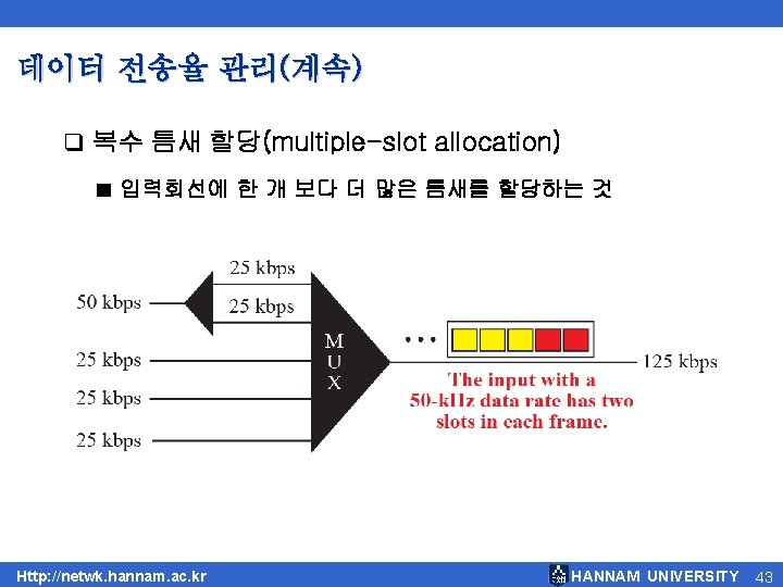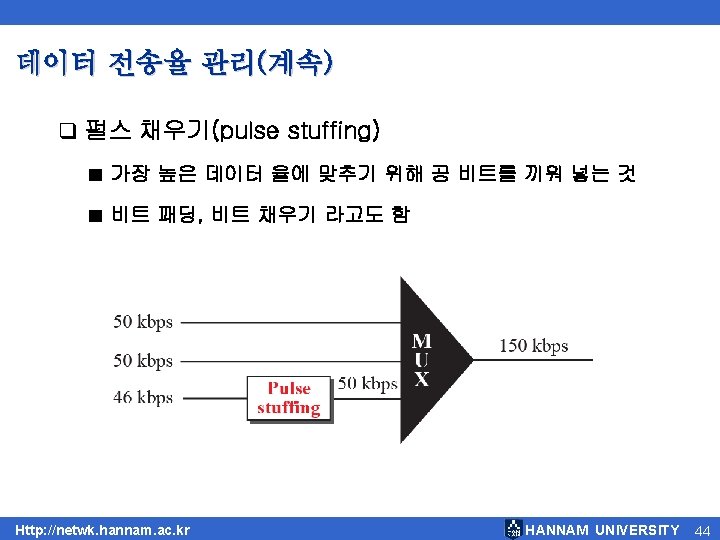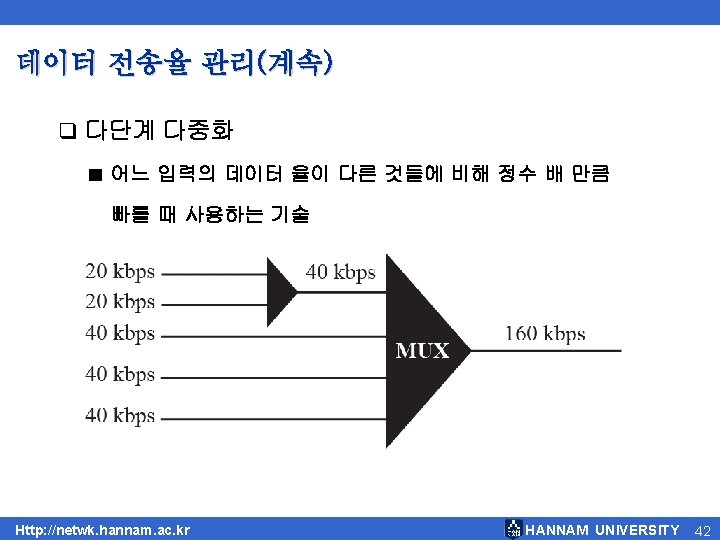 데이터 전송율 관리 q 입력 측 데이터율 이 서로 다른 경우 해결 방법 ① 다단계 다중화(multilevel multiplexing) ② 복수 틈새 할당(multiple-slot allocation) ③ 펄스 채워 넣기(pulse stuffing) Http: //netwk. hannam. ac. kr HANNAM UNIVERSITY 41