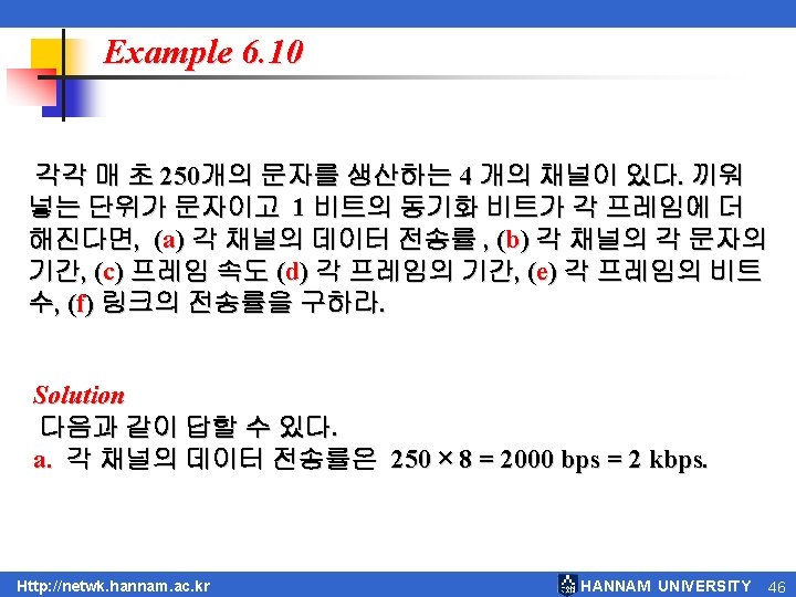 6. 1. 3 시분할 다중화(계속) q 프레임 동기화(Frame synchronization) ■ 프레임 구성비트(framing bits) Http: //netwk. hannam. ac. kr HANNAM UNIVERSITY 45