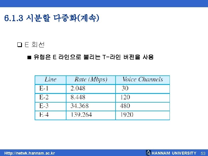 6. 1. 3 시분할 다중화(계속) q DS와 T회선 전송속도 Http: //netwk. hannam. ac. kr HANNAM UNIVERSITY 50