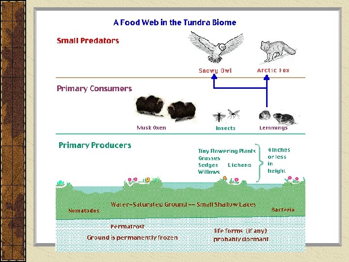 Tundra animals Most are seasonal migrators i. e. Birds Few predators Birds feed on insects, migrating predators feed on birds Small herbivores but no reptiles or amphibians