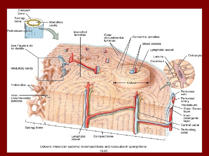 Compact bone terms Osteon/Haversian System: structural unit of compact bone. Oriented parallel to shaft and forming a group of hollow tubes through which an artery, vein and nerve pass into and through bone. Lacunae: small cavities (halo’s) containing osteocyte Osteocyte: true bone cell, spider shaped and found in lacunae at the junctions of the lamellae Lamellae: layers of the collagen fiber matrix with each layer going in opposite direction to the adjacent layer.