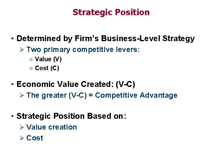Strategic Position • Determined by Firm’s Business-Level Strategy Ø Two primary competitive levers: Value (V) v Cost (C) v • Economic Value Created: (V-C) Ø The greater (V-C) = Competitive Advantage • Strategic Position Based on: Ø Value creation Ø Cost