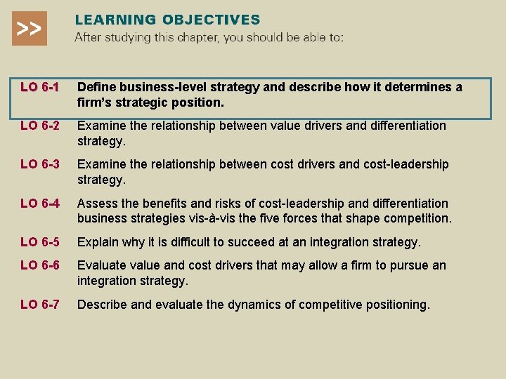 LO 6 -1 Define business-level strategy and describe how it determines a firm’s strategic position. LO 6 -2 Examine the relationship between value drivers and differentiation strategy. LO 6 -3 Examine the relationship between cost drivers and cost-leadership strategy. LO 6 -4 Assess the benefits and risks of cost-leadership and differentiation business strategies vis-à-vis the five forces that shape competition. LO 6 -5 Explain why it is difficult to succeed at an integration strategy. LO 6 -6 Evaluate value and cost drivers that may allow a firm to pursue an integration strategy. LO 6 -7 Describe and evaluate the dynamics of competitive positioning.