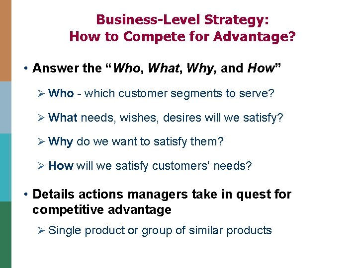 Business-Level Strategy: How to Compete for Advantage? • Answer the “Who, What, Why, and How” Ø Who - which customer segments to serve? Ø What needs, wishes, desires will we satisfy? Ø Why do we want to satisfy them? Ø How will we satisfy customers’ needs? • Details actions managers take in quest for competitive advantage Ø Single product or group of similar products
