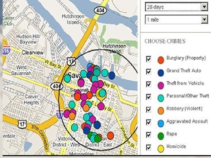 Practice Exercise You are a squad sergeant for the city / county of ____. Your city has experienced a rise in major crime in last two months. You had seen an increase in crime and have responded to the following: • • 9 Burglaries 6 Robberies 15 Thefts 2 Non-fatal shootings 5 Auto Thefts 3 Sexual Assaults 2 Assault on police officers Your job is to create a crime map identifying areas of hot-spots. You have the freedom of placing some type of marker on the map that identifies the crimes listed. • The purpose is to inform your patrolmen of high crime areas for identifying areas for directed patrol. • Create a legend too! 15 minutes