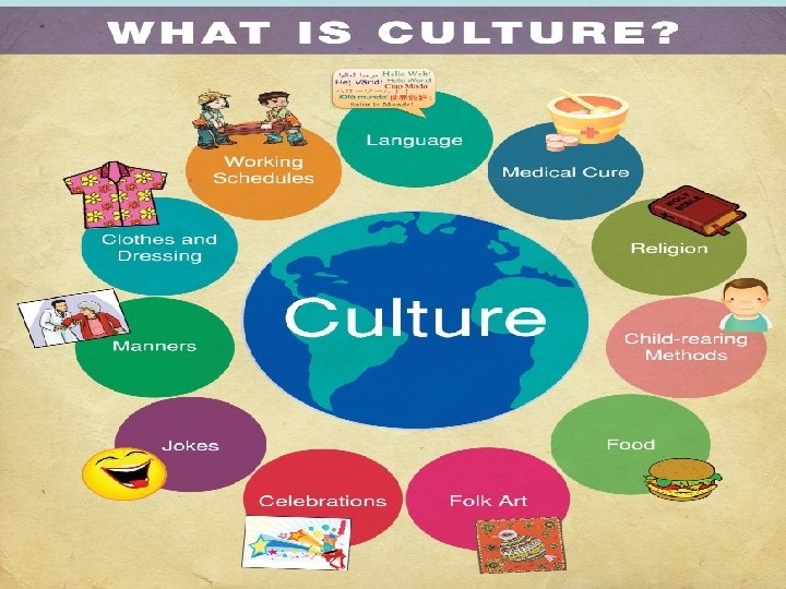 Culture • Values, beliefs, practices of a particular group • Incorporates attitudes & customs learned through socialization with others • Includes-language, styles of communication, traditions, religion, art, music, dress, health beliefs, practices • Passed on from generation to the next • Culture is learned from birth • Shared by members of a group • Influenced by environment, technology & availability of resources • Dynamic and ever changing
