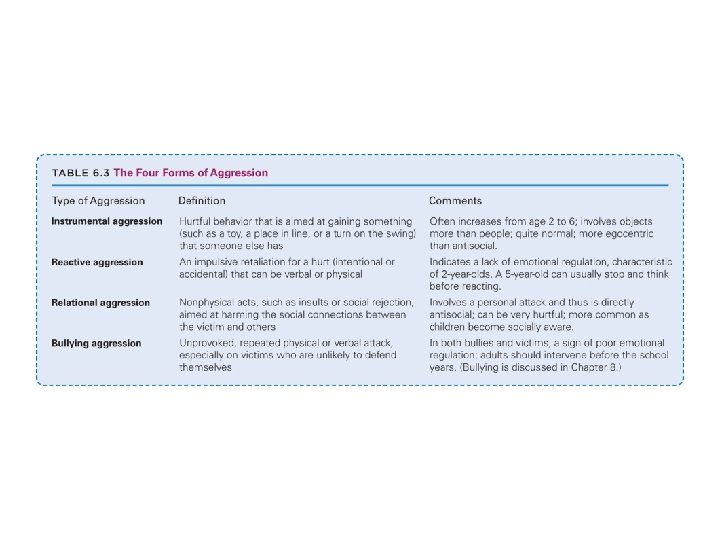 • As children experience brain maturation and socially develop, children are able to control their aggressive tendencies. • There are 4 major types of aggression • Instrumental aggression hurtful behavior that is intended to get something another has • Reactive aggression retaliation for another person’s intentional or accidental action, verbal or physical • Relational aggression non-physical acts such as insults or social rejection, to harm the social connection between victim and other people • Bullying aggression unprovoked repeated physical or verbal attacks, victims are unlikely to protect themselves