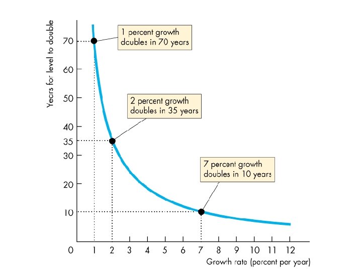 The Basics of Economic Growth • Standard of living depends on real GDP person. • Real GDP person grows only if real GDP grows faster than the population grows. • Rule of 70 • number of years it takes for the level of a variable to double is approximately 70 divided by the annual percentage growth rate of the variable
