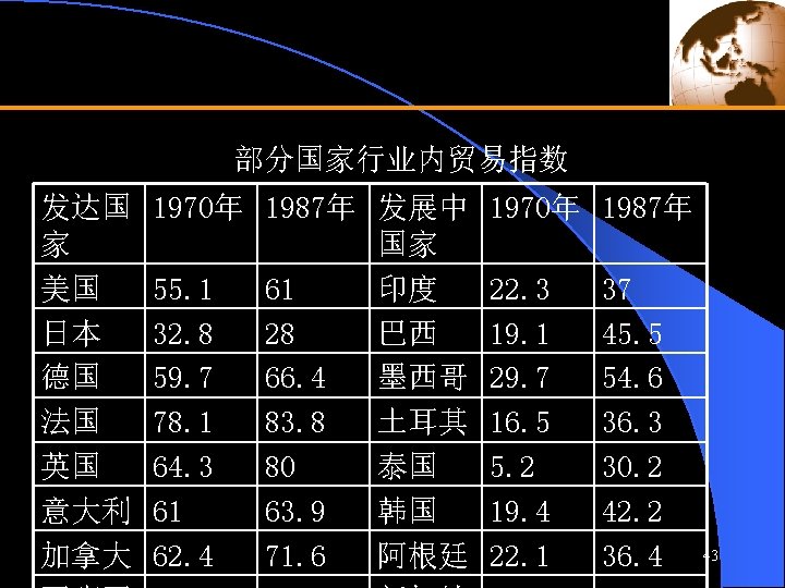 l The Significance of Intraindustry Trade – About one-fourth of world trade consists of intra- industry trade. – Intra-industry trade plays a particularly large role in the trade in manufactured goods among advanced industrial nations, which accounts for most of world trade. 41