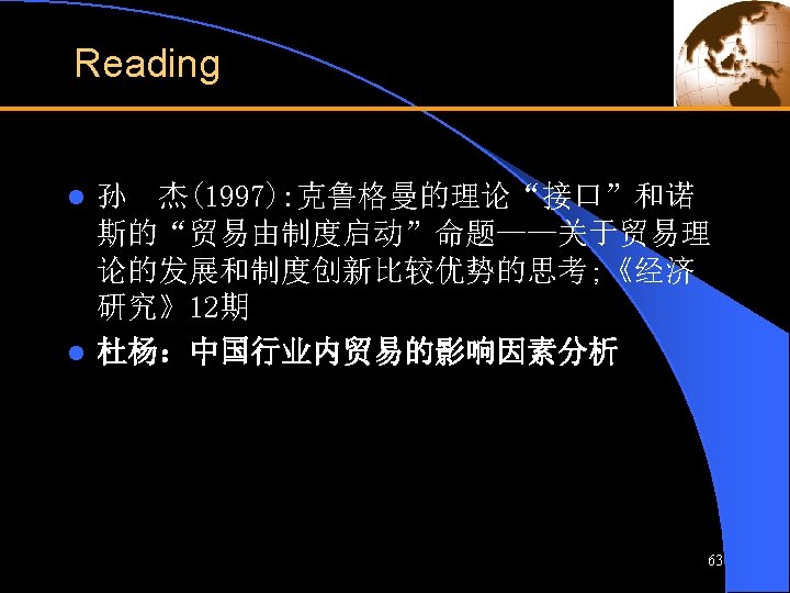Summary Dumping occurs when a firm charges a lower price abroad than it charges domestically. l Dumping can occur only if two conditions are met: l – The industry must be imperfectly competitive. – Markets must be geographically segmented. External economies give an important role to history and accident in determining the pattern of international trade. l When external economies are important, countries can conceivably lose from trade. l 62
