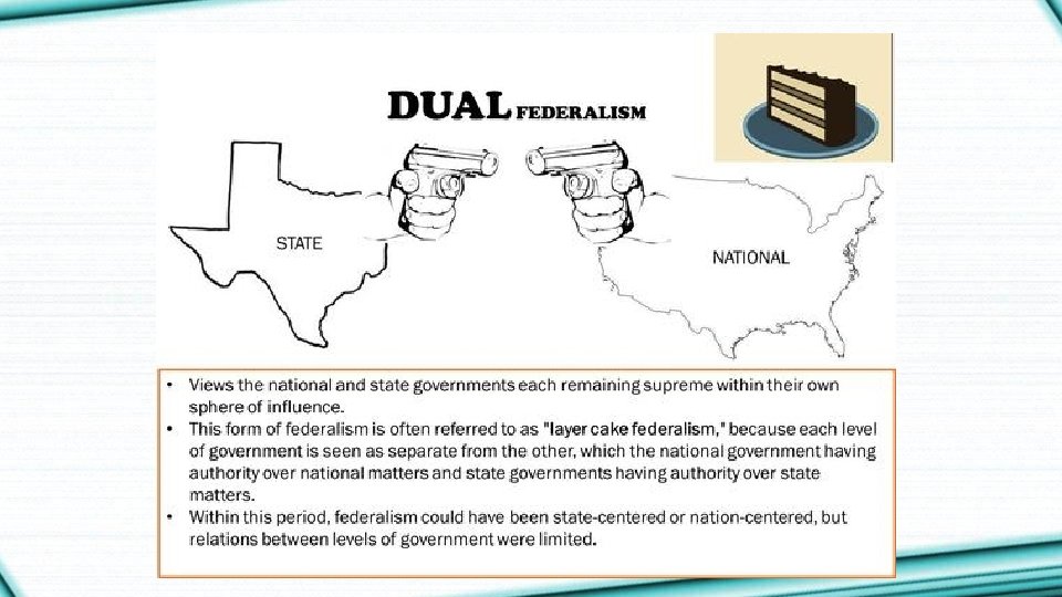 Dual Federalism: A Layer Cake of Divided Powers • Dual Federalism (layer cake) - The two levels of government (national and state) are part of a whole, but each has its own responsibilities. • Mc. Culloch v. Maryland (1819) - Set the supremacy of the national government over the states. • Gibbons v. Ogden (1824) - Set the precedent that the national government is responsible for interstate commerce. • Interstate Commerce - Trade among states (controlled by national government). • Intrastate Commerce - Trade within the borders of a state (controlled by state).